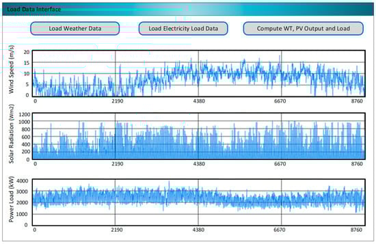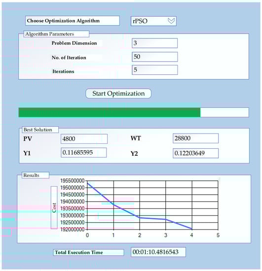 Once the data load button is clicked, the data files for weather data and load demand data are uploaded. The weather data contain data for solar radiation data and wind turbine data. The data are normalized and displayed in the form of line graphs, as shown in Figure 6, which shows graphs for load in kWh, solar radiation in Wm2, and wind speed in m/s. When the data are loaded and normalized, the optimization interface is selected where different options about selected algorithms are entered. In this work, we implemented a variant of PSO named rPSO as a core optimization algorithm. The algorithm takes parameters such as the problem dimension, the number of particles, and the number of iterations. The number of particles is selected based on the output parameters, and the dimension is the variables in the solution space. It can be seen from the interface in Figure 7 that the optimization algorithm runs on the data to produce optimal parameters such as WT, PV, ESS, y0, and y1. It also gives the time in which the optimization is completed.