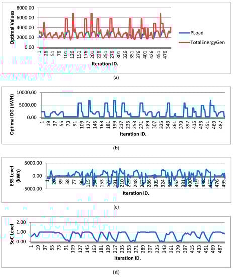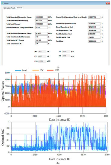Once the optimization algorithm runs, the EMS algorithm runs to give the operation plan based on optimal values. Figure 8 shows the optimization result interface. The results section has two distinct interfaces: Figure 8a, which is the overall summary of the optimal values, and Figure 8b, which shows the respective graphs for load, PV, and ESS, and the optimal values, which contain the installation cost, total renewable energy generated, total load demand, and other configuration values. This results interface gives an overview of the operational cost and the total installation cost. The primary motivation of the microgrid is to make the most use of renewable energy and less of diesel generators. The low operational cost is a reflection of the high use of renewable energy sources, which is the goal of hybrid microgrids.