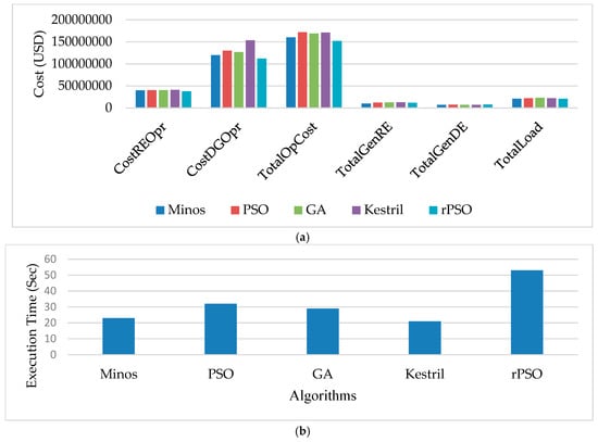 The performance of the system is measured in terms of operational cost and renewable energy penetration. The cost of the system is also measured in terms of different costs such as renewable energy operational cost (CostREOpr), diesel operation cost (CostDGOpr), total load, total generated renewable energy, and total generated diesel expenses, as shown in Figure 10. The cost of the rPSO as shown in Figure 10a is lower than PSO, GA algorithms, and AMPL solvers. The maximum gain of the proposed rPSO is observed for diesel operation, which is very crucial. The low cost indicates that the diesel is operated for a lesser amount of time than its counterparts. Figure 10b shows the execution time response of different algorithms. It is evident from the figure that rPSO is the slowest in terms of execution time.