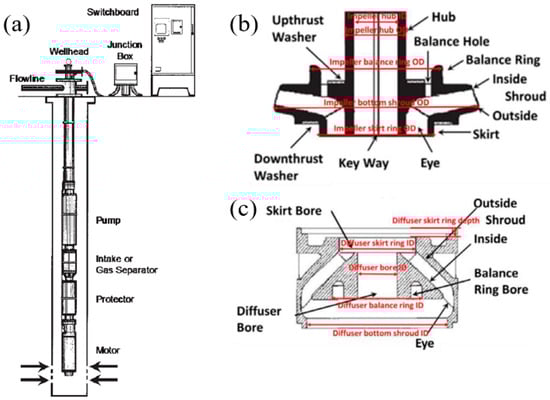 (a) Conventional electric submersible pump (ESP) installation (Carvajaldiaz 2012 [5]); (b) an example of impeller front view (Takacs 2009 [4]); (c) an example of diffuser front view (Takacs 2009 [4]).