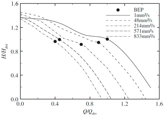 Curves of normalized pressure head versus flow rate at a certain rotational speed for different fluid viscosity (Ofuchi 2017 [16]).