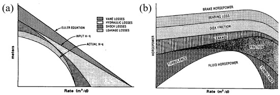 (a) Head losses versus flow rate in an ESP (Divine 1993 [25]). The difference between an ideal Euler formula and actual H-Q curve is shown, including vane losses, hydraulic losses, shock losses, and leakage losses. (b) Power losses versus flow rate in an ESP (Divine 1993 [25]). The gap between brake horsepower and fluid horsepower is divided into turbulence, friction, leakage, disc friction, and bearing loss.