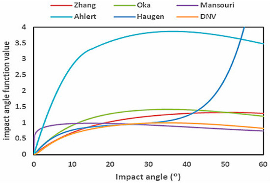 Impact angle functions of six erosion models (Zhu 2018 [50]).