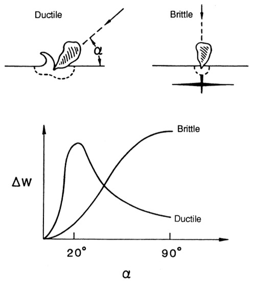 Extending from Finnie’s model, Bitter [46,47] combined a ductile and brittle erosion model by bringing in the concept of a threshold velocity. Erosion occurs only if the impact velocity is larger than the threshold, when the target material is brittle. The suggested threshold velocity is related to the Young’s modulus of elasticity and the Poisson’s ratios of the particle and the surface. The wear curve for brittle material is incremental and reaches a maximum at 90°, and that for ductile material is similar to Finnie’s (Figure 7). The same weakness appears whereby there is no erosion at zero impact angle, which does not correspond with reality. Afterward, Neilson and Gilchrist [48] simplified Bitter’s model to a certain extent with an adopted empirical constant. Ding [49] took repeated impact into account with the kinetic theory of granular flow. Despite some progress, the mechanism of erosion is still not fully explained.