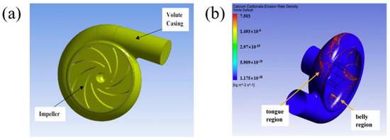 (a) Centrifugal pump casing model (Noon 2016); (b) erosion rate density (Noon 2016) [59].