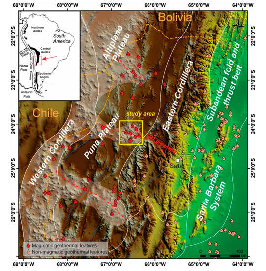 In the last decades a worldwide renewed interest in the use of geothermal energy has been stimulated by the increasing energy demand, the cost rise in production of fossil fuels and its environmental impacts and the technological advances in exploration and exploitation of geothermal resources [1,2]. The development of geothermal prospects in north-west Argentina and other Andean regions is a very important goal, given the presence of large heat anomalies associated with the magmatic arc (Figure 1). The widespread recent volcanic activity defines a variable-width Andean geothermal belt of anomalous heat flux (>150 mW/m2) that are inferred to host vast high-temperature geothermal resources [3]. In addition, to the east, numerous thermal springs are located along the frontal structures of the Andean retro-wedge (Figure 1), although related to normal to slightly anomalous geothermal gradient, e.g., [3,4,5]. Despite these favourable geological conditions and its high potential, the Andes still represent the largest undeveloped geothermal region in the world due to financial and technical barriers as well as geoscientific aspects [6]. Nowadays, geothermal resources in Argentina have not been exploited on a large scale and rarely they have been directly used [7]. This is due mostly to the lack of detailed surficial geological information in several geothermal areas limiting the development of accurate conceptual models and interpretation of the available geophysical and geochemical data. In this sense, in recent years several research groups and private companies have revealed the existence of numerous sites of interest for geothermal exploitation in north-west Argentina, e.g., [4,5,8,9,10,11,12,13].