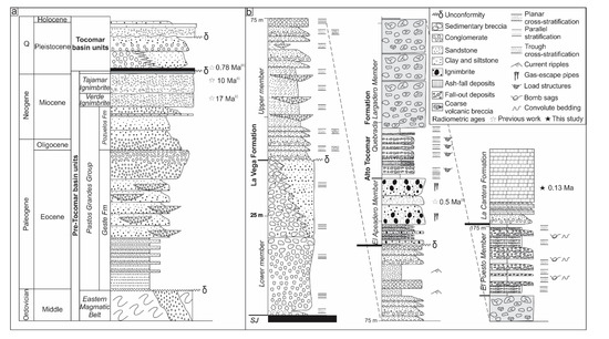 - Petrinovic, I.A.; Piñol, F.C. Phreatomagmatic and phreatic eruptions in locally extensive settings of Southern Central Andes: The Tocomar Volcanic Centre (24°10′ S–66°34′ W), Argentina. J. Volcanol. Geotherm. Res. 2006, 158, 37–50. [Google Scholar] [CrossRef]