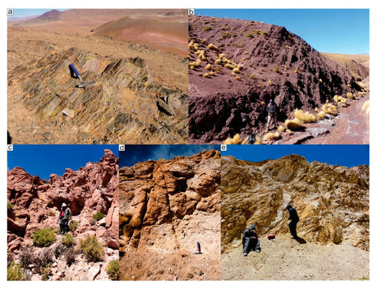 Field views of the pre-Tocomar basin units. (a) Ordovician meta-volcanic rocks. (b) Alternating dark reddish siltstone and fine-grained sandstones from the Geste Formation. (c–e) Unaltered, partially and highly altered Tajamar Ignimbrite, respectively.