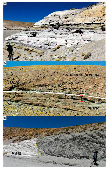 Field views of the Alto Tocomar Formation. EAM: El Apeadero member; QLM: Quebrada Largadero member; EPM: El Puesto member. (a) Ash-fall deposits and tephra layers intercalated within pyroclastic density current deposits from El Apeadero member; (b) Quebrada Largadero member (person for scale highlighted in red ellipse). Note the marked reverse grading from well-bedded pyroclastic deposits to boulder volcanic breccia; (c) well-stratified volcanic deposits of the El Puesto member. The contact with the deposits of the El Apeadero member is marked by the yellow dashed line.