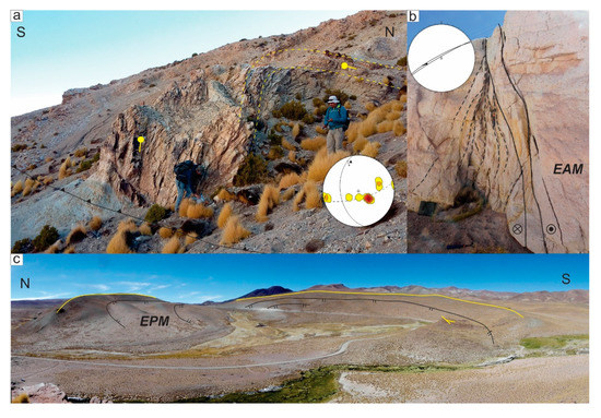 - Coutand, I.; Cobbold, P.R.; De Urreiztieta, M.; Gautier, P.; Chauvin, A.; Gapais, D.; Rossello, E.A.; López-Gamundí, O. Style and history of Andean deformation, Puna plateau, northwestern Argentina. Tectonics 2001, 20, 210–234. [Google Scholar] [CrossRef]