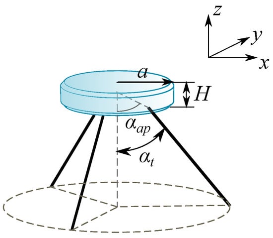 A wave energy converter chosen for this case study is a fully submerged cylindrical buoy connected to three tethers to absorb wave power from its motion in multiple degrees-of-freedom (or multiple modes). namely surge, heave and pitch. As shown in Figure 1, the geometry of this WEC is determined by the radius a and height H of the cylinder, tethers inclination angle , and the angle that defines the tether attachment point (from the centre of mass of the buoy). The submergence depth (distance from the undisturbed water level to the top of the buoy) is considered fixed and equal to 2 m regardless of the buoy size. The mass of the buoy is taken as half the displaced mass of water (the density of water is kg/m, and the buoy volume is ). The hollow buoy houses three direct mechanical drive power take-off units (each connected to the tether). Each PTO acts as a spring-damper system where stiffness and damping coefficients can be adjusted for each sea state.