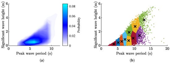 The wave climate at the Marettimo deployment site, Italy (12.04°E, 37.96°N, 6.38 kW/m mean annual wave power resource) [37]: (a) wave scatter diagram, and (b) clustering of the wave data where crosses correspond to ten representative states.