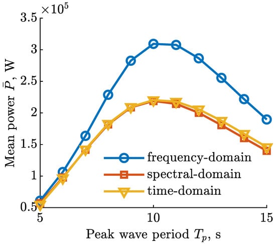 Power production of a three-tether WEC in irregular waves estimated using three different models: frequency-, spectral-, and time-domain. Parameters of the WEC are m, m, , kN/m, kN/(m/s)), irregular waves have the significant wave height of m and modeled using the Pierson–Moskowitz spectrum.