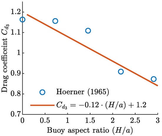 Even though only one geometric shape (vertical cylinder) is used in the study, the magnitude of the viscous drag force, and the corresponding Beq, are highly dependent of the ratio between the cylinder height to its diameter, especially for the heave mode. Therefore, it order to develop an optimisation procedure that can accommodate WEC geometries with various aspect ratios (), the drag coefficient in heave is expressed as a function based on published data [50] shown in Figure 4. Drag coefficients in other directions are not sensitive to the cylinder aspect ratio and are kept fixed for surge and sway, and for roll and pitch. The irregular waves from Table 1 are modelled using the Bretschneider (modified Pierson–Moskowitz) spectrum according to [51].