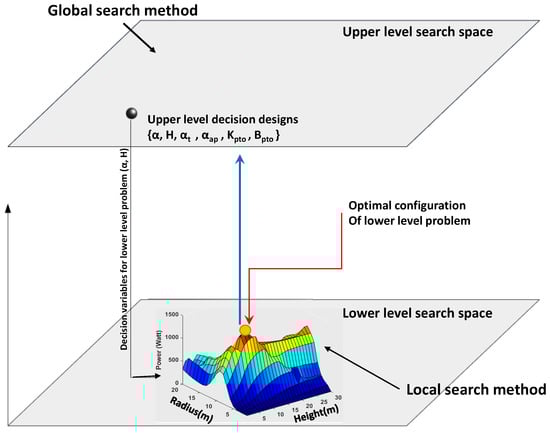 In this paper, two new bi-level optimisation methods are proposed with the aim of maximising the harnessed power output. These methods are also designed to minimise the levelised cost of energy of a fully-submerged, cylindrical WEC with three tethers for the wave climate of a Mediterranean sea site in the west of Sicily, Italy (featuring unidirectional irregular waves). The optimisation of a combination of WEC radius, height, tether inclination and attachment angles, and power take-off parameters is a relatively computationally expensive (5000 evaluations take around 15 h), multi-modal, large-scale and complex problem. These characteristics provided the principal motivation for investigating and proposing a faster and more reliable optimisation technique. With this in mind, we applied a bi-level strategy to optimise the design variables at various levels. A global search method was used at the upper level to optimise the parameters of the whole WEC’s. Furthermore, in the lower level, a Nelder–Mead (NM) simplex search method was applied to adjust the geometry settings and tether angles. To systematically compare the effectiveness of the proposed optimisation method, we considered seven state-of-the-art evolutionary and swarm algorithms. The experimental results showed that the bi-level method can outperform other meta-heuristics in terms of both convergence rate and the quality of WEC’s configuration. Moreover, according to the best-found configurations, if we focus on maximising the harnessed power output without considering the costs, a large cylindrical buoy is recommended. However, the cheapest energy can be delivered by a relatively small WEC with a radius of 5 m and a height of 2 m.