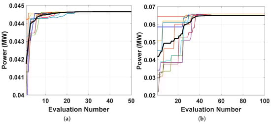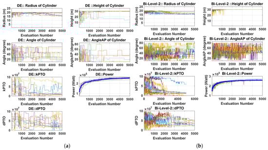 Search history and trajectory of the best solution per each population in all decision variables. (a) the optimisation process (power maximisation) of DE, (b) Bi-level-2.
