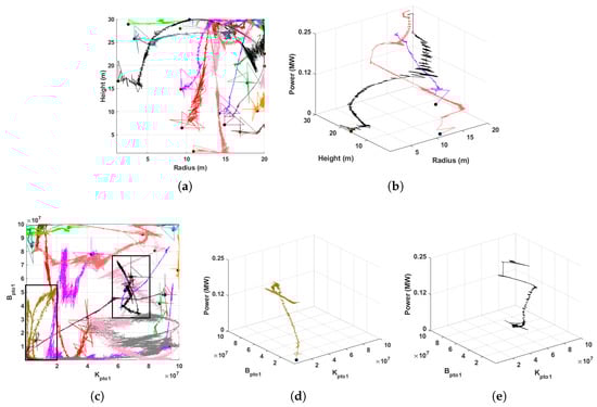 In order to see the convergence performance of Bi-level optimisation algorithms, the search trajectory of the best agent in each generation for all decision variables is shown in Figure 11. Initially, we can see the high convergence ability of Bi-level-2 compared with DE in order to find and converge to the optimal range of both radius and height. Meanwhile, It can be observed that Bi-level-2 tends to explore promising areas of the tether angle search space broadly, and finally, to exploit the best values.