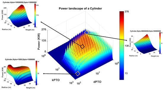 To estimate the power output and LCoE for any WEC geometry, Equation (2) is solved inMATLAB. The mass matrix has a diagonal form M = diag(mb, mb, mb, Ixx, Iyy, Izz) with moments of inertia calculated for the cylindrical body. Hydrodynamic parameters of the WEC, including the added mass A(ω), hydrodynamic damping B(ω), and excitation force vector are estimated using a semi-analytical model [48,49]. Beq is calculated based on the iterative procedure explained in Section 2.3.