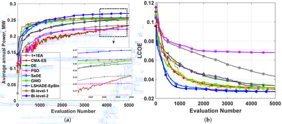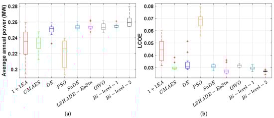 Figure 9b shows the box-and-whiskers plot for the best configurations of the WEC which deliver the minimum LCoE for each run for nine search heuristics. It can be seen that the performance of Bi-level-2 is more reliable than that of the other meta-heuristic algorithms we applied. Both LSHADE-EpSin and Bi-level-1 show the next best average performances by 0.028 and 0.0295, respectively.