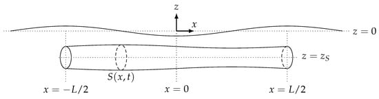 We model the device as a horizontal cylinder, parallel to the free surface, with the depth of its axis. Let L be the length of the cylinder (constant) and its cross section at rest (that is when the device is immersed but static). The cylinder is modeled as a one-dimensional (1D) system (since ) and its deformation is assumed to be axisymmetric. We denote, by , the cross section at position and at time t (see Figure 1 for a schematic of the system).