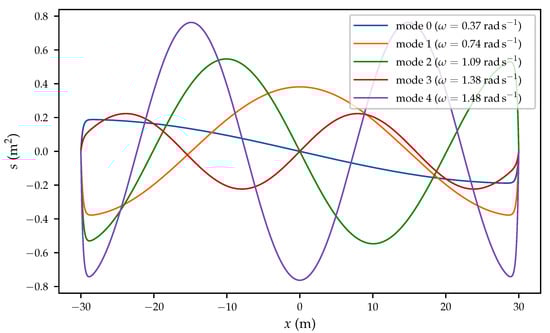 where is the deformation profile of mode i, as plotted for instance on Figure 2. Thus, a constraint on the norm of can be interpreted as a constraint on the minimal and maximal variations of the cross section s. However, the exact relationship between and the norm of is unknown. (In particular, the normalization using the scalar product (15) of the modes leads to non-trivial values of for all i.) For a given bound b in (11), the actual maximal geometrical deformation of the WEC is only checked a posteriori. This is a limitation of the current implementation.