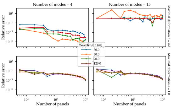 A convergence study has been done to quantify the margin of error due to the discretization of the cylinder for the BEM solver. For the same physical parameters, the maximal absorption width has been computed with several discretizations of the cylinder between and panels. As no analytical solution was available, the reference solution has been chosen as the solution with the finer mesh. The relative error for a mesh of N panels has been computed, as follows: