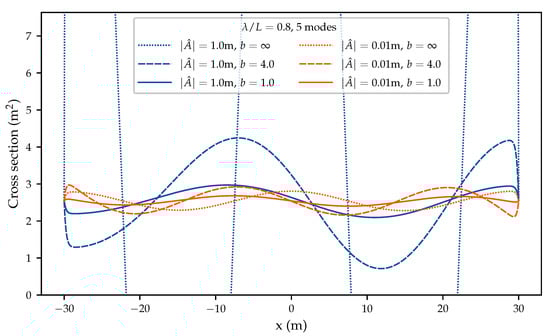 The blue lines correspond to a wave amplitude of 1 . For unconstrained motion (dotted lines), the maximal deformation has no physical meaning (negative cross-section). When a constraint is applied to the optimization process ( or ), the maximal deformations are more physically reasonable. They are actually on the boundary of the domain of the optimization problem, that is . For a lower wave amplitude (orange line), the deformations are physically meaningful with or without constraint, as discussed above.