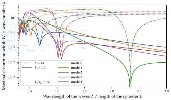 In this section, the maximal absorption width W computed while using the theory of Section 2.1 and Section 2.2 is plotted. The results are presented in dimensionless form. Two different dimensionless forms of W are of interest. On one hand, the normalization by the wavenumber k is interesting to retrieve the theoretical result of (7). On the other hand, the normalization by the dimension of the cylinder makes sense from an engineering point of view if the absorption width is geometrically interpreted as the length of wave front that is absorbed by the device. The former is used in this section, whereas the latter is used in the next section.