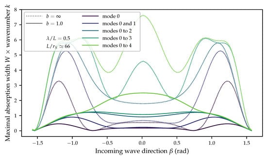 In this paper, we have only used a relatively small number of modes. It will be of interest to use more modes. For that, finer meshes will be required to ensure that low-wavelength modes are correctly modeled by the BEM solver. Adding more modes can only result in a higher absorption width. The results that are presented in this paper can be seen as a lower bound of the absorption width in this respect.