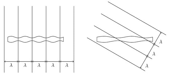On Figure 7, a single wavelength of incoming waves is considered, but the angle of the incoming wave is varying. In the unconstrained case, (7) can now be exactly verified: the averaged absorption width over all directions is equal to the number of dofs that we model. Some dofs have a higher unconstrained maximal absorption width for waves that are not traveling in the same direction as the device. This can be explained by the schematics in Figure 8: waves that excite a given mode of deformation when traveling along the device can excite another one when traveling in a different direction. However, this theoretical effect might not be applicable in practice: this effect gets much lower when a constraint is applied on the maximal deformation. The constrained maximal absorption width of several modes appears to be almost monotonous with respect to the direction of the incoming waves.