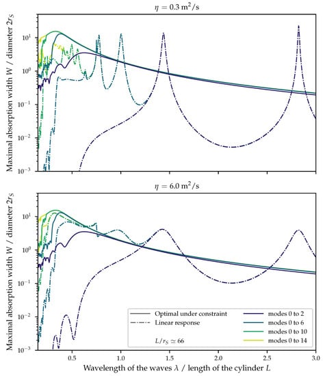 For , the absorption width of the linear response is one or two orders of magnitude lower than the constrained maximum for most wavelengths. In practice, the excitation of the cylinder by the incoming waves does not exactly produce the deformation that would capture the most power for this . Some resonance peaks are visible for some wavelengths, especially near , , and , where L is the length of the cylinder. On the resonance peaks, the absorption width is high (around 10 diameters of the cylinder). The absorption width on these peaks is higher than the maximal reasonable absorption width (solid lines). It must then correspond to an amplitude of deformation that is unrealistic. The linear model only allows for us to predict that the deformation would be out of the scope of the linear model at this point.