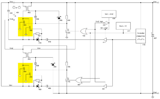 In the bipolar converter, the bulk voltage of the transistors of the unused converter would be higher than the drain voltage and the bulk drain diode would be forward-biased. In Figure 4, this is avoided by connecting the bulks of both starting transistors 404 and 454 and the LX1 switches 420 and 470 to GND. Since the GND potential is always below Vin1 and Vin2, the parasitic diodes are never forward-biased and problem 2 is solved.