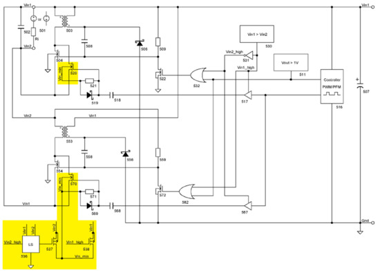 With the two PMOSs 537 and 538 and the level shifter 536, the voltage “Vin_min” is generated which is equal to the lower of the input voltage potentials. This voltage is connected to the bulks and the gate drivers of the LX1 switches 520 and 570. With this improvement, there is no body effect and no forward-biased MOS diode. The LX1 switches 520 and 570 only need to be dimensioned for the input voltage. In the used 180 nm production process, this gives a huge area and performance benefits since 1.8 V low-threshold transistors with L = 180 nm can be used instead of standard 5 V L = 500 nm transistors.
