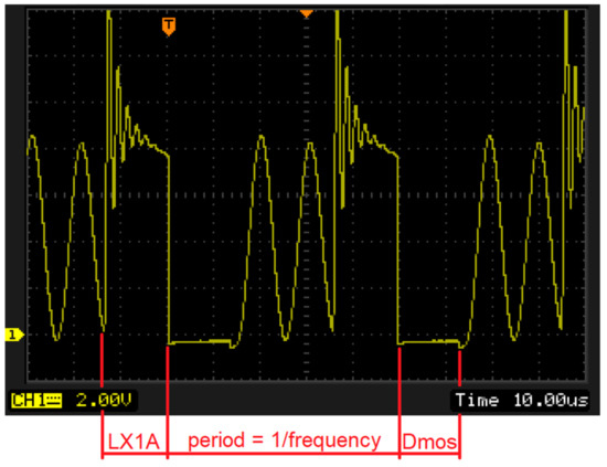 The flyback converters of Mercury and Mercury2 (this work) were programmed to a frequency of 20 kHz and a duty cycle of 28% for an input resistance of 4 Ω. Figure 7 shows the LX2A waveform with an LX1A switch on-time of 14 µs and a period of 50 µs. The DMOS A is switched on for 13 µs and turned off before the zero crossing of the secondary current.