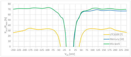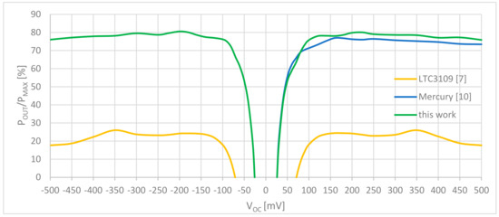 Compared to LTC3109, Mercury2 shows a much higher efficiency in the range of ~70%. Further, the minimum VOC for operation is much lower.