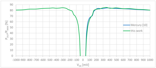When compared to Mercury, Mercury2 shows a slightly higher efficiency at positive VOC. The efficiency is nearly equal for positive and negative input voltages. Note that Mercury does not work at negative VOC.