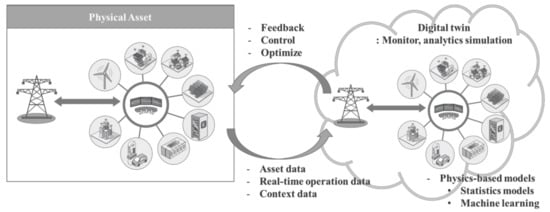The concept of the digital twin [,] was first introduced by Grieves in 2002, and NASA formalized its definition in 2012. Digital twin technology utilizes IoT (Internet of Things), clouding computer and cyber physics systems developed to detect physical problems more quickly and to better predict physical outcomes. Figure 1 illustrates the digital twin concept for microgrid.