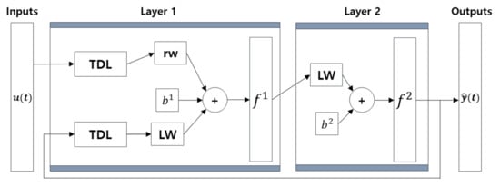 Nonlinear autoregressive with external input (NARX) [] is a nonlinear autoregressive neural network with external inputs. It learns to predict the original time series using the previous value of one time series, a feedback input value, and a second time series, which is an external time series []. It is a two-layer feedforward network that has a sigmoid transfer function in the hidden layer and a linear transfer function in the output layer. As shown in Figure 3, the output y(t) can be trained efficiently through an open feedback loop that is fed back to the network input through delay.