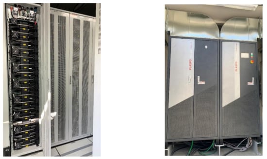 Energy storage system under field operation: battery racks (left), inverter and transformer (right).