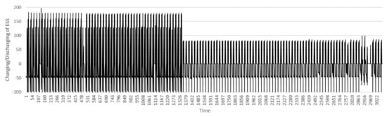 The ESS daily optimal scheduling [] such as Figure 4 applied to the EMS uses an optimization-based algorithm, and an objective function is defined to maximize the savings in electricity bills. The rated charging/discharging output of the ESS, the battery capacity of the ESS, and the minimum and maximum power reception of consumers were set as constraints.
