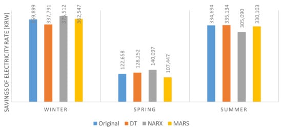Table 4 shows the savings of electricity bills by season, and the optimal refers to the optimization technique used when operating the actual ESS. The electricity bill saved by operating the ESS was 817,259 Korean won (KRW). When the electricity bill was calculated using MARS, the electricity bill was reduced less at KRW 800,097, and when the ESS was operated using NARX, the electricity bill was reduced the most at KRW 820,699. The electricity bill savings by season is demonstrated in Figure 8, with the savings higher in spring than in winter and summer, when electricity rates are high.