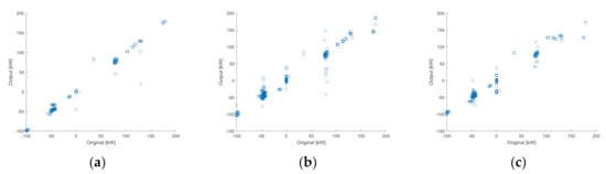 The simulation results and actual operation results that were analyzed are shown in Figure 9. The horizontal axis of the graph shows the actual ESS operation results, and the vertical axis shows the ESS operation results estimated through simulation. The highest similarity when comparing the DT and actual operation results linearly is shown in Figure 9a–c, which are also linear, but outliers, which differ significantly from the actual values, were found more compared with DT. The outliers were more when the NARX method was used rather than the MARS method.