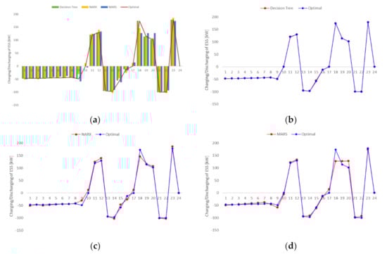 (a) Optimal schedule of ESS for minimization of operation cost at spring, (b) real and simulation results with DT, (c) real and simulation results with NARX, (d) real and simulation results with MARS.
