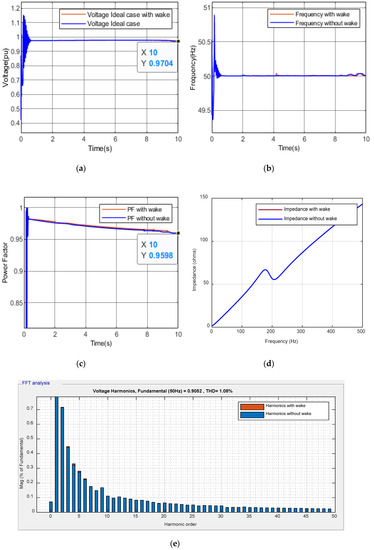 The winter seasonal timestamp was taken on 4 January; its power system parameters are compared in the ideal scenario 1. The voltage (V) revolved around 0.97 pu (Figure 5a) and was overlapped with frequency (F) (Figure 5b). The change in the power output influenced the PF to vary according to wind speeds and was far beyond the ideal PF case (Figure 5c). The impedance (Z) curve was comparatively smooth with the high impedance of 500 ohms going against 500 Hz, at least when compared to the 143 ohms in the ideal case, as shown in Figure 5d.