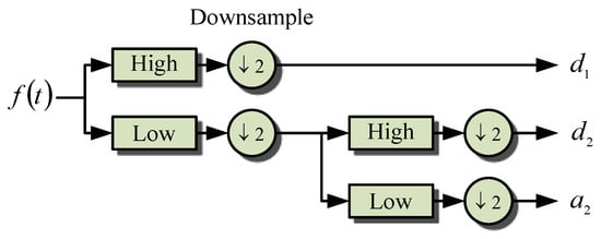 The function is decomposed by the scaling function and the mother wavelet function through the scaling change and wavelet transform. The scaling function is considered to be a low-pass filter and the mother wavelet function is considered to be a high-pass filter. The structure shown in Figure 1 decomposes the signal into a high- and low-frequency signal. The low-frequency signal is decomposed for the second time and the decomposed signals, and can be yielded as follows: