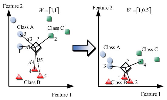 From Figure 3, the weight is in the left diagram and the weight is in the right diagram. The equation mentioned above shows that the weight change can influence the classification results. Because, initially, Class A is a high probability, the probability of Class B will be stronger than that of Class A after the changed weight. Feature 2 has less effect on the classification results. The weight adjustment can alter the effect of different features on classification results and eliminate certain invalid features to raise the classification accuracy.