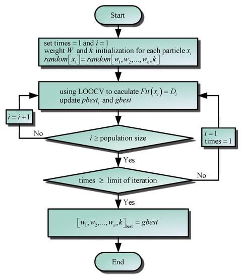- Suppose the number of all features is , select all features and use the cross one out cross-validation (LOOCV) to compute the classification accuracy of PWKNN, which is the criterion of raising the classification accuracy. is the weight after the PWKNN optimization.