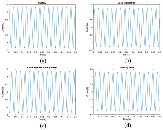 Generator output current: (a) Healthy; (b) Loss of lubrication; (c) Rotor angular misalignment; (d) Bearing fault.