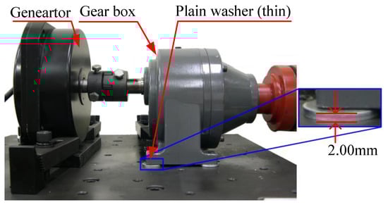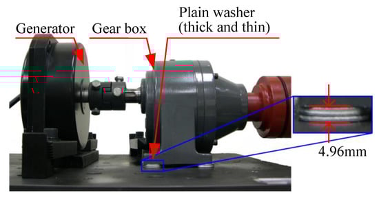 Rotor angular misalignment occurs when the rotor angles of the power generator and gearbox misalign. Normally, two rotor angles are at the same level, as shown in Figure 8. Nevertheless, a large wind turbine is at high altitudes and easily influenced by an external force. The base probably misaligns due to lengthy external vibration, resulting indirectly in rotor angular misalignment. In this research, rotor angular misalignment occurs when the height of the gearbox is lowered, shown in Figure 9. This testing is to remove the thin plain washer to lower the height. After putting the thick and thin plain washers under the gearbox, its rotor angle reaches the same level as that of the power generator. The height of the thick plain washer is 2.96 mm and the thin plain washer is 2.00 mm. The output current of the power generator is shown in Figure 7c.