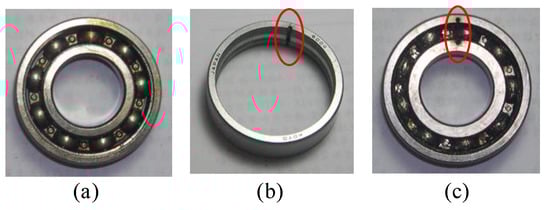 The bearing: (a) Healthy; (b) Outer raceway after damage; (c) Damaged bearing.